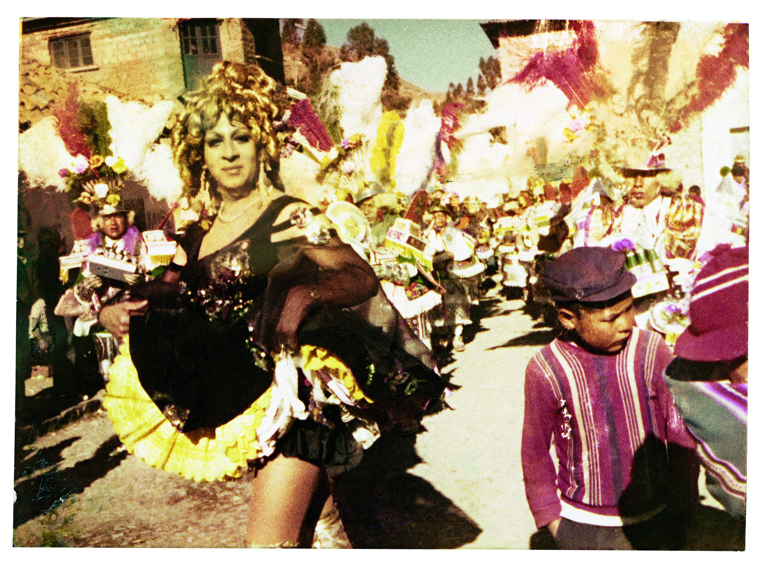 La China Morena, personaje del tradicional baile de la morenada boliviana, brilló en los carnavales de Oruro y en las grandes fiestas de La Paz en los años 70. Impulsadas por el activismo de Carlos Espinoza (la Gran Ofelia) e inspiradas en el glamur de las vedettes de la época, estas performances fueron fundamentales para la visibilidad travesti en Bolivia. Prohibida en 1975 por la dictadura militar de Hugo Banzer, la tradición de la “China Morena” fue interrumpida, pero reapareció en fiestas más rurales y, a partir del 2000, en las intervenciones del grupo de la Familia Galán. Las fotos aquí presentadas pertenecen al archivo creado por David Aruquipa Pérez, dedicado a la recuperación de la memoria trans boliviana.