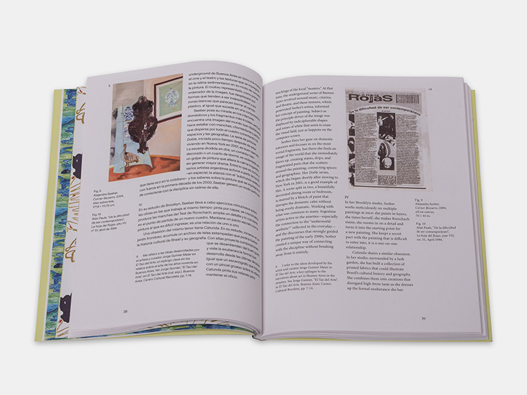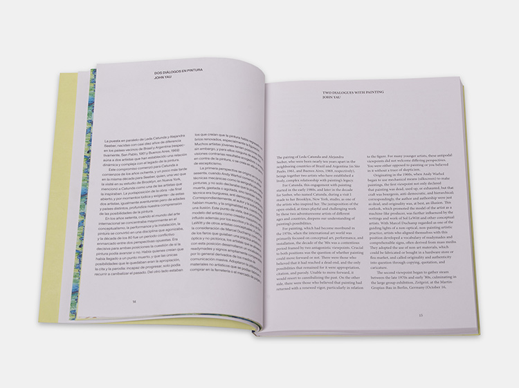 Editado en ocasión de la muestra, desde su diseño y materialidad el libro resuena con el título del proyecto. En paralelo y en dos salas distintas del museo, las obras de cada artista se despliegan para propiciar una singular forma de diálogo -entre sí y con el espacio expositivo- que se vuelve visible en la sección de obras reproducidas, iluminada por tres textos centrales y especialmente escritos para la publicación. En el ensayo curatorial, el investigador Francisco Lemus repasa el trabajo de ambas artistas a la luz de sus procedimientos pictóricos y saberes y de la influencia que reciben de la cultura urbana, el arte moderno, el diseño, la música y la naturaleza. Por su parte, el crítico y poeta estadounidense John Yau contextualiza las obras de Seeber y Catunda dentro del derrotero contemporáneo de la pintura y se detiene minuciosamente en algunas de sus piezas más representativas. El volumen incluye además una entrevista de Josefina Barcia a ambas artistas, que nos permite acercarnos a algunas de sus preocupaciones comunes a través de sus propias voces.
