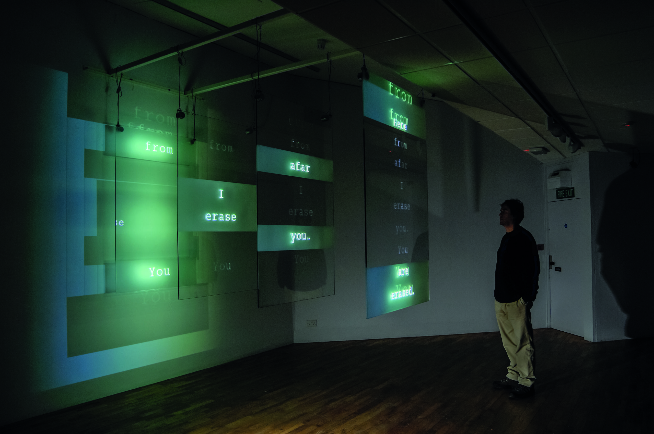 “Es muy simple pero intenso, y la estructura visual piramidal del poema es conveniente para la obra. Edgardo [Rudnitzky] sugirió trabajar con voces femeninas. No estábamos seguros acerca de qué debían cantar, pero no queríamos que simplemente recitaran el texto. Finalmente decidimos que cantaran el sonido de las letras cada vez que aparecían en los diferentes vidrios. Las letras aparecen y desaparecen jugando con la idea de borrar el texto”.