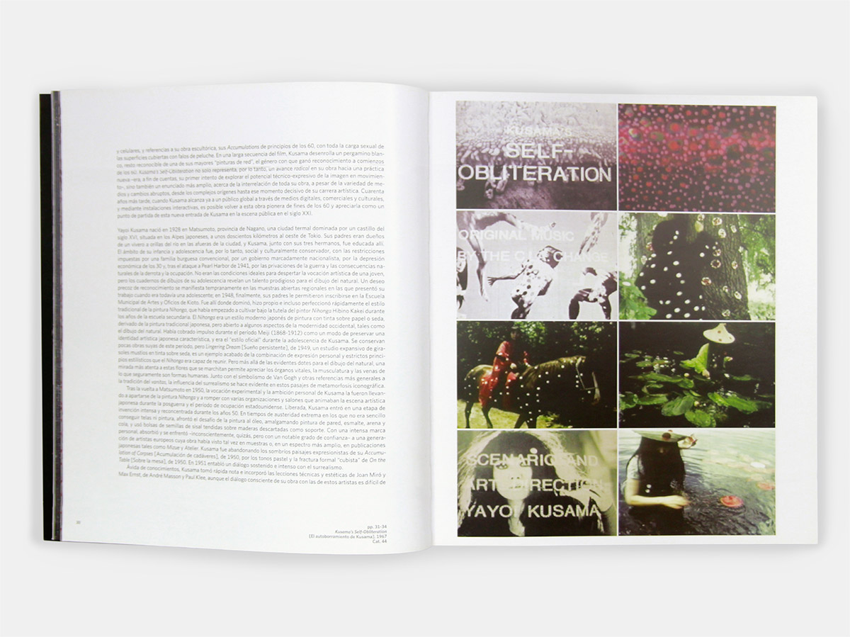 Además de los dos ensayos curatoriales, que abordan la trayectoria artística de Kusama (Morris) y la especificidad de su enfermedad mental en relación con su obra (Larratt-Smith), el catálogo incluye una selección de reproducciones de obra y una extraordinaria cronología visual compuesta por imágenes de archivo.
