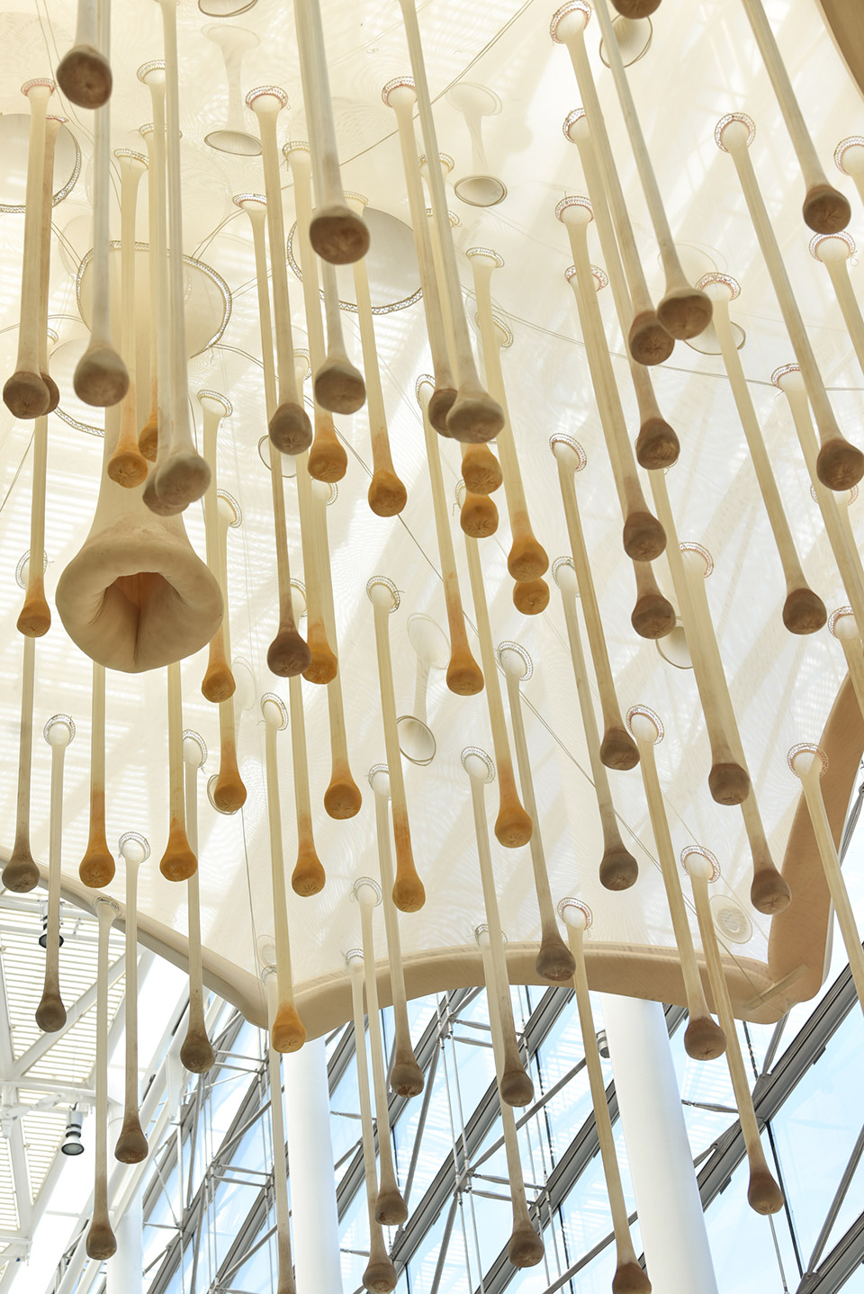 En el vocabulario artístico de Neto, los sacos con especias se llaman “cópulas”, denominación que conduce a la idea de unión. La cópula liga una cosa con otra como ocurre, precisamente, en el copular sexual. Y una flor no es sino el brote reproductor de las plantas. En esa suerte de flor invertida que construye aquí Neto, los filamentos terminan en cavidades que contienen condimentos en reemplazo del polen destinado a perpetuar la especie. A su vez, los pétalos de tul están rematados por vigas curvas de madera, engarzadas unas con otras, que definen una amplia corola. Neto ha afirmado esta comparación al expresar, “pienso en esta escultura como si fuera una flor –tiene que tener pétalos y color y también perfume». Sus palabras manifiestan su interés por las formas orgánicas y la percepción, como también su voluntad de crear obras que el público pueda tocar, mirar, disfrutar y oler.