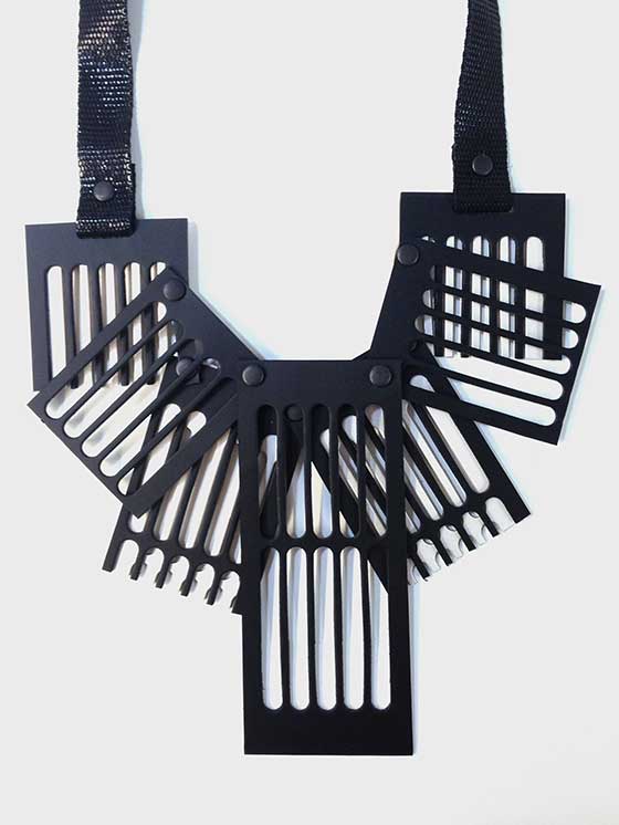 A partir de la muestra Polesello joven, las diseñadoras de Perfectos Dragones crearon cuatro líneas inspiradas en obras icónicas de Rogelio Polesello. Se trata de un collar, como pieza principal, un sobre, un aro y un prendedor. Trabajaron con las tramas, la trasparencia, la geometría y el color como eje principal, y los materiales que utilizaron son el acrílico y el cuero ecológico.