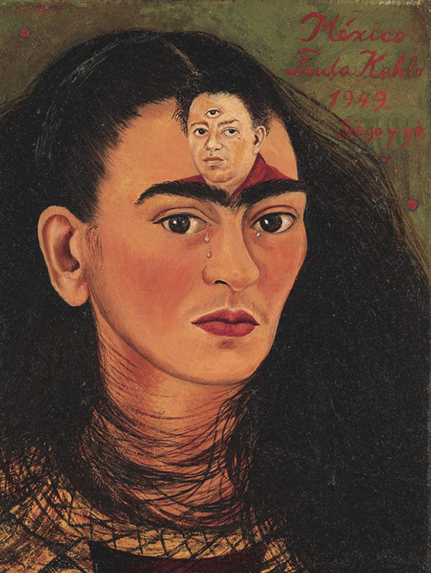 “Así como el accidente cambió mi camino, desde entonces mi obsesión fue recomenzar de nuevo pintando las cosas tal y como yo las veía, con mi propio ojo y nada más”. Hija de Matilde Calderón, una mestiza católica, y Guillermo Kahlo, judío alemán, Frida Kahlo tuvo desde pequeña una mirada meticulosa y una inclinación por lo científico. Sin embargo, en 1925, cuando tenía 18 años, sufrió un accidente que marcó su destino. El vehículo en el que viajaba fue embestido por un tren, causándole múltiples fracturas en la columna. En el curso de los años posteriores al accidente le fueron practicadas unas 27 cirugías. Si bien Frida conoció a Diego Rivera en 1922, cuando él realizaba los murales del anfiteatro Bolívar, fue en 1928 que se inició el romance y al año siguiente contrajeron matrimonio. Entre 1930 y 1934 la pintora se instaló en Estados Unidos junto a Diego, cuyos murales tenían gran demanda en las principales ciudades americanas. Allí comenzó a vestirse con largas faldas, blusas bordadas y huipiles, a usar joyas prehispánicas y el pelo recogido al modo tradicional de Tehuantepec. En 1938 André Breton y su mujer, la pintora Jacqueline Lamba, visitaron México y en 1939, por invitación del poeta, Kahlo viajó a París y participó con 17 obras de la exhibición Mexique. Si bien existen claras vinculaciones entre la liberación del inconsciente del surrealismo y la personal poética de Kahlo, ella rechazaba esta adscripción ya que su estilo era preexistente al vínculo con Breton.