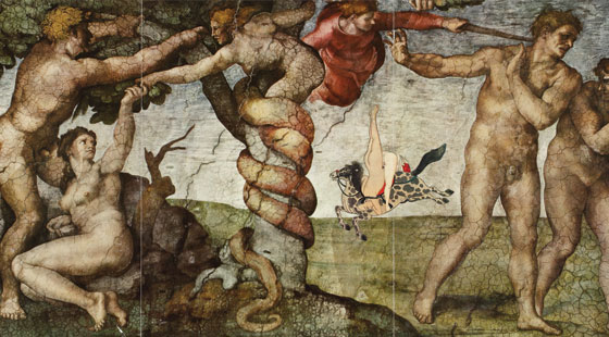 El efecto de la política de montaje que el artista pone en acción en este tipo de obras es el de desenmascarar -por medio del encuentro de dos realidades ajenas en el tiempo histórico- los vínculos entre religiosidad y violencia que subyacen en el discurso bíblico. Para Ferrari “la Biblia es una antología de crueldades” y varias de las imágenes de sus collages remiten a la profunda diferencia que existe entre la concepción cristiana del pecado y la cosmovisión oriental del erotismo.
