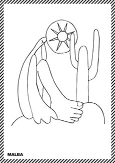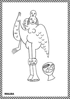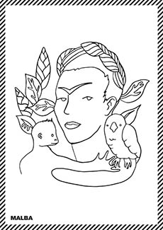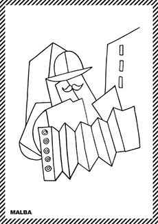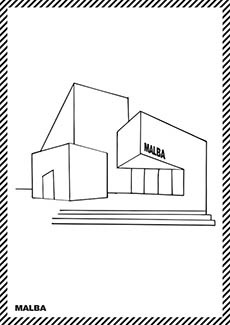 Dibujos inspirados en las obras: Autorretrato con chango y loro, de Frida Kahlo; La mañana verde, de Wifredo Lam; La canción del pueblo, de Emilio Pettoruti; Retrato de Ramón Gómez de la Serna, de Diego Rivera; Abaporú, de Tarsila do Amaral; y el edificio de Malba.