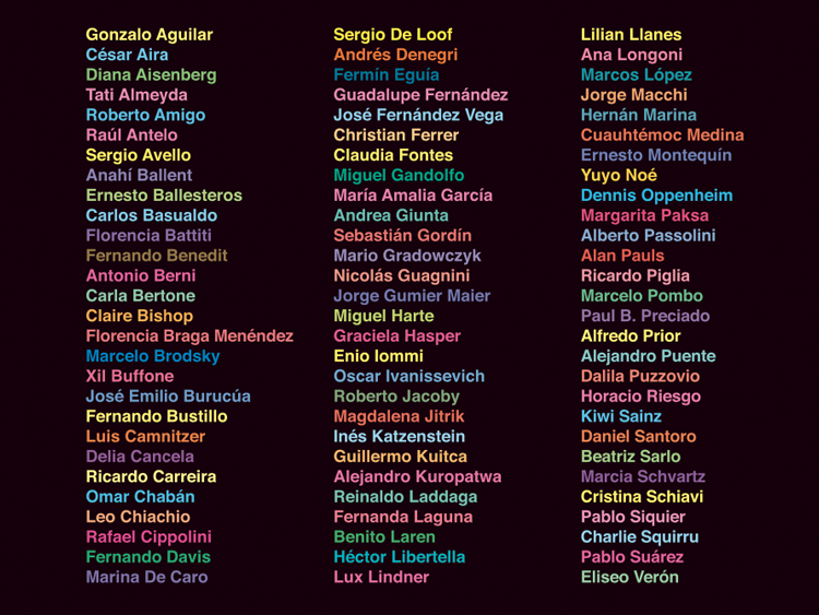 Participan: Aimé Iglesias Lukin, Alberto Passolini, Alejandra Seeber, Alejandro Ros, Ana Longoni, Ana Gallardo, Andrea Giunta, Daniel Santoro, Diana Aisenberg, Fernanda Laguna, Flavia da Rin, Gonzalo Aguilar, Guadalupe Maradei, Kiwi Sainz, Leo Estol, Marina De Caro, Mario Scorzelli, Marula Di Como, Roberto Amigo, Roberto Jacoby, Santiago Villanueva, Tomás Espina, entre otros. Música: Ceci y Gastix.