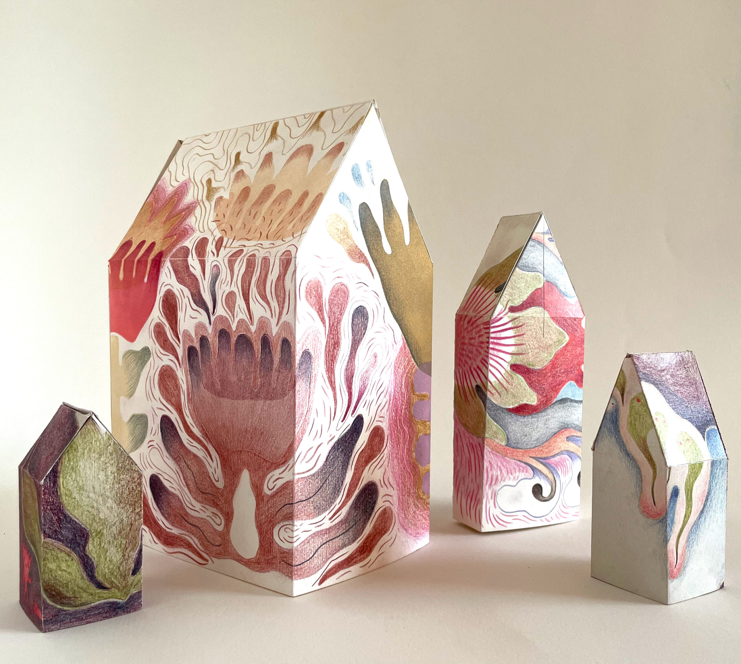 En el universo creativo de Sandra Vásquez de la Horra el dibujo trasciende los límites del papel como superficie plana para convertirse en una estructura: casas, acordeones y objetos tridimensionales conforman un cuerpo de obra que invita a ser recorrido y explorado desde distintos ángulos, revelando, en cada vuelta, una imagen distinta. El dibujo se transforma en una experiencia que se despliega en el espacio.