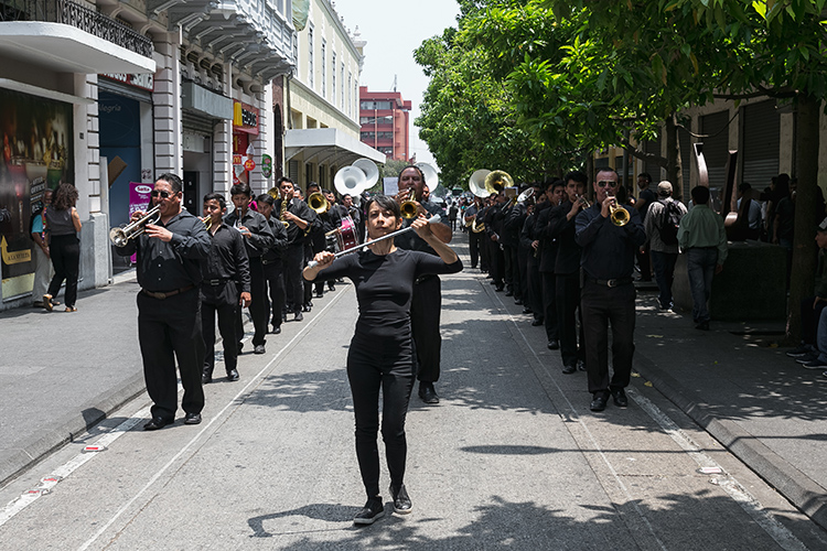 En contraste con el atuendo llamativo lleno de adornos y de colores que habitualmente llevan los integrantes de bandas musicales, el grupo iba vestido de negro, convirtiendo lo que suele ser un evento festivo en una especie de acto fúnebre. La artista participó del desfile, caminando igualmente hacia atrás y sosteniendo un bastón en posición vertical. La performance habla del retroceso socio-político que afecta a Guatemala pero que también se vive a escala mundial.