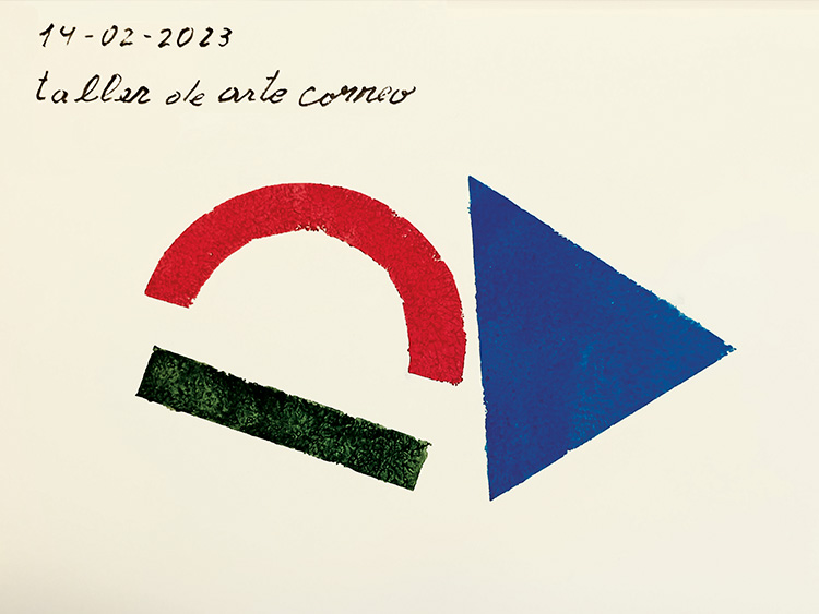 A partir de formas abstractas preconcebidas, el taller propone la creación de piezas de arte correo con tintas de colores que se aplicarán generando ritmos sobre una hoja con formato plegable. La pieza de arte correo podrá ser enviada a través del mostrador de correo presente en el museo.