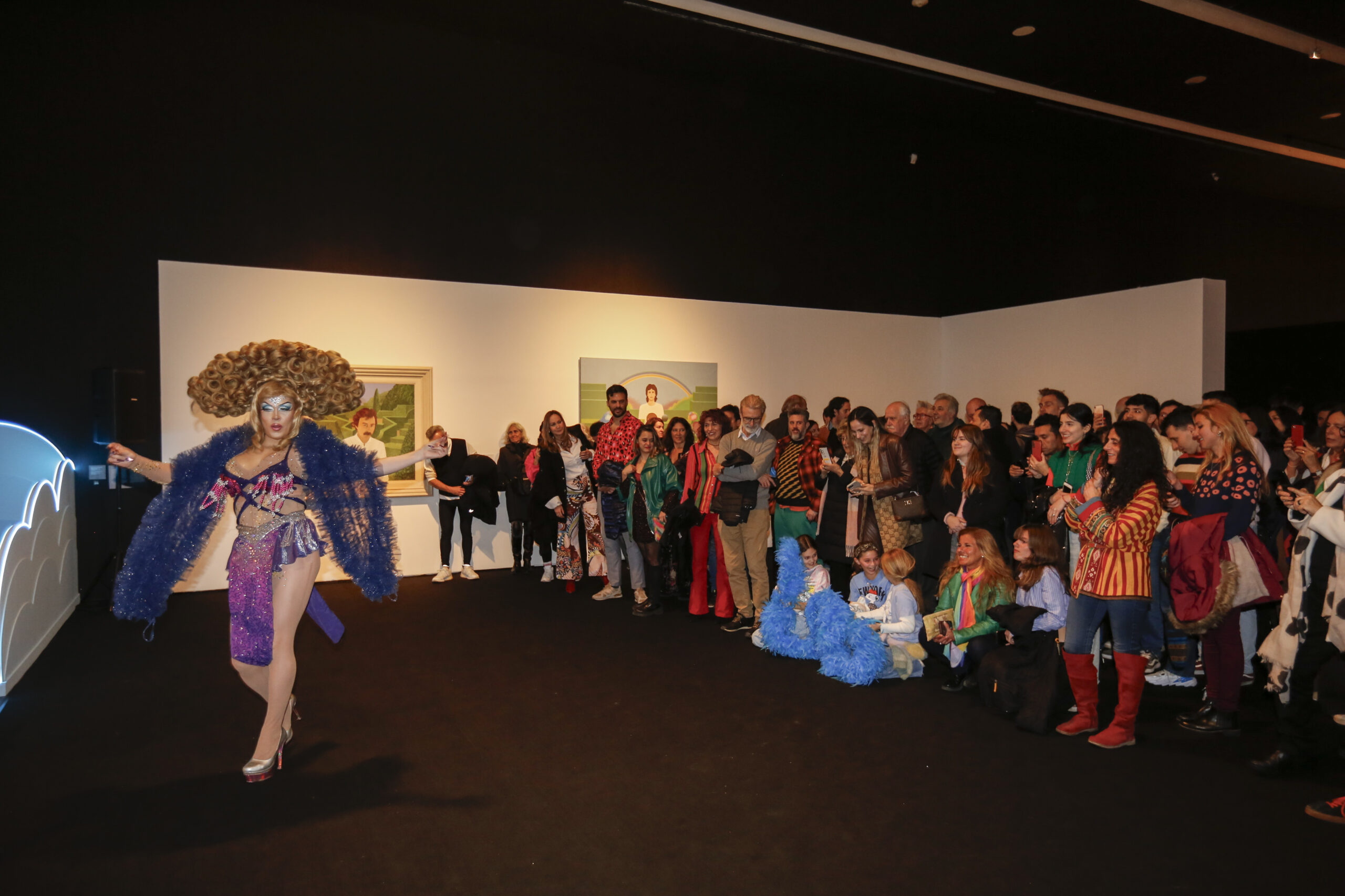 A continuación, se abrieron las puertas para que los visitantes recorrieran las salas del segundo piso vestidos de colores como indicaba el dress code de arcoíris. Allí, acompañando la reconstrucción de la escenografía que Giménez realizó en 1967 para la película Psexoanálisis, pudieron disfrutar de la performance de Vedette emulando el look del personaje de Libertad Leblanc en el film.