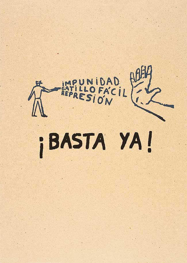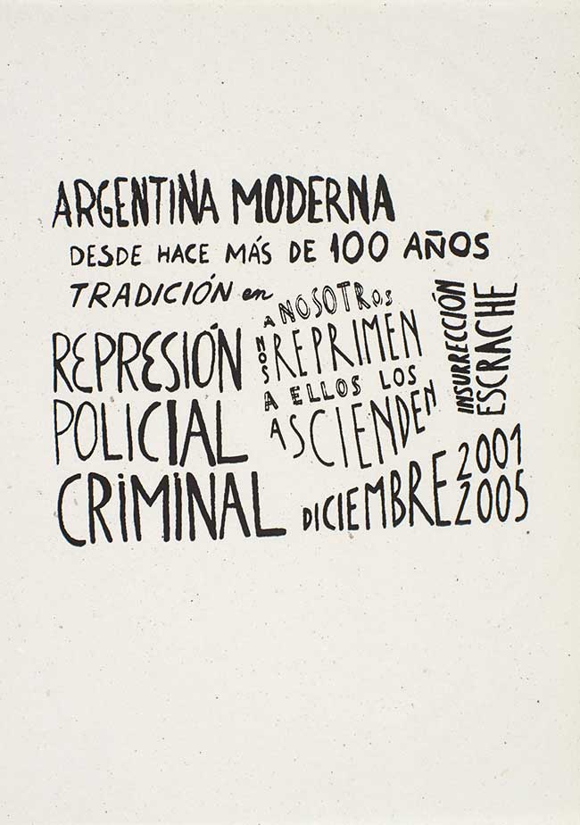 La serigrafía tiene un largo pasado, más de tres mil años podríamos decir. Y un largo pasado revolucionario que se hace evidente durante la revolución industrial. No se necesita más que una malla y los papeles o telas amarradas a un bastidor de madera, y las tintas. La magia de pronto aparece. Imágenes que son textos y textos que son imágenes aparecen en la pobreza de los acampes y comedores populares. Nunca olvidaré a la multitud sacándose la camiseta y esperando, en aquellos días de verano, que se las estamparan, que los chicos y las chicas del Taller Popular de Serigrafía imprimieran en ellas un mapa de Argentina con los nombres de los muertos en la lucha de esos años, o con “Brukman es de los trabajadores”, con la frase “Que se vayan todos”, “Darío y Maxi presentes”, “Trabajo, dignidad, cambio social», “Represión es crimen, protesta es conciencia». O los versos de un poema que yo escribí: “Mañana es primero de mayo y acá / el que puede compra asado…”.