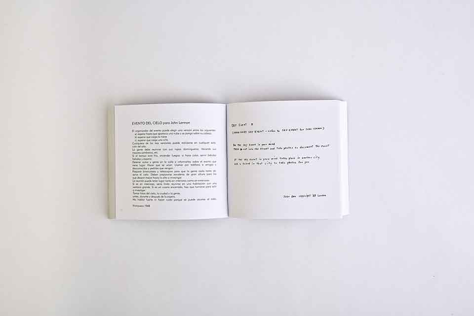 Este ya mítico libro de “Instrucciones” de Yoko Ono fue publicado originalmente en una edición limitada de 500 ejemplares por Wunternaum Press, Tokio, en 1964. En 1970, se publicaron traducciones en Nueva York, Frankfurt, Londres y Buenos Aires, en ediciones que contenían el material original junto a otras piezas y dibujos realizados en años subsiguientes por la artista. La edición argentina, de Ediciones de la Flor, fue la primera publicada en español, en un momento en el que eso representaba una apuesta arriesgada: se trataba de un libro experimental de una autora que por entonces no gozaba del indiscutible reconocimiento mundial que hoy tiene.