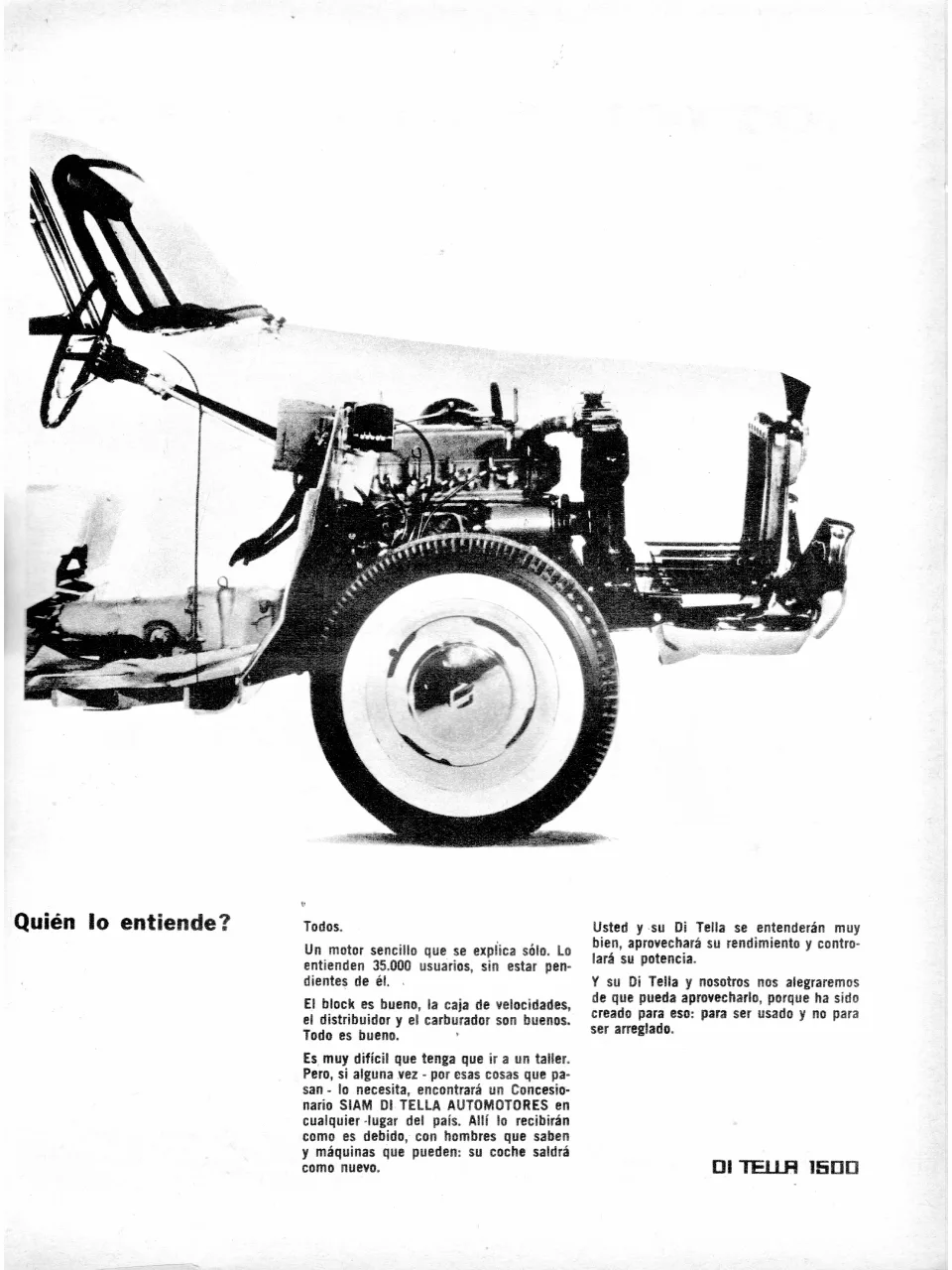 El SIAM Di Tella 1500 fue en la primera mitad de la década de 1960 el auto más popular del país. Modelo elegido por la mayoría de los taxistas e incluso por Papá Noel en un olvidado spot televisivo, fue parte de la geografía urbana. Agens, la agencia cautiva del grupo Di Tella, acercó como ninguna el diseño gráfico a la dirección de arte con sus estilizadas publicidades en diarios y revistas. No menos notable, la redacción de los titulares y textos empleó un tono porteño, desinhibido, cercano al público, en sincronismo con el carácter del automóvil, para destacar sus características técnicas y virtudes.