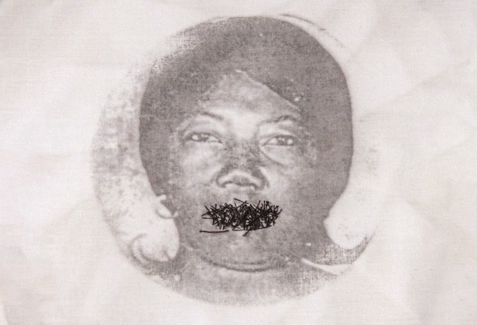 La interrogación es, también, sobre el lugar de las mujeres. El de ella, el de las de su familia, el de las mujeres negras en la sociedad brasileña en la que, por la racialización, por la pobreza, ocupan la base de la pirámide social. Las suturas (Rosana prefiere esta palabra antes que el término costura) cruzan los ojos, la boca, el cuello. Obliteran los sentidos, la palabra, el pensamiento, tal como lo hacían en las mujeres esclavizadas los castigos que se les imponían y de los que nos llegan imágenes del siglo XIX. [4]