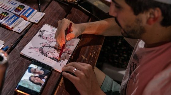 Tres artistas dibujan las selfies tomadas en el museo para que los y las asistentes se lleven un recuerdo dibujado en vivo.